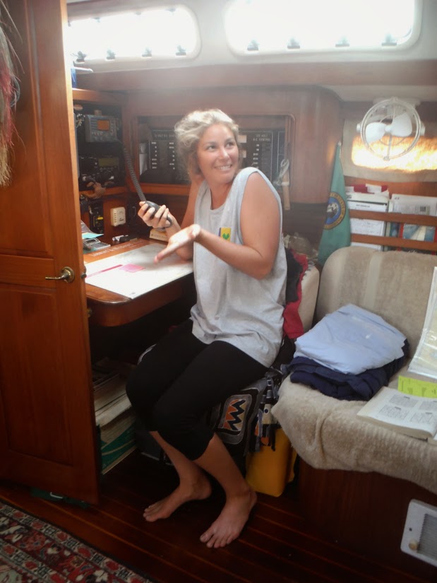 The Captain orders the deck slave to carry the heavy main sail cover off the cabin's top into the cockpit then down the companionway stairs and stow it on the floor at the foot of master bedroom suite. (Good thing she's strong and has developed her sea legs!)